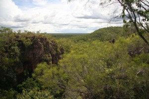 On enchaîne ensuite sur les Buley Rockholes, des sortes de bassins naturels entourés de petites cascades dans lesquelles des gens se baignent. Il faut dire que la température de l’eau est agréable et que les crocodiles ne viennent pas à cet endroit. On continue avec les Florence Falls, des sympathiques chutes d’eau, au pied desquelles on peut se baigner. Les australiens sont prudents : il y a une bouée de sauvetage à côté du plan d’eau. Globalement on est peu nombreux, les parkings sont vides à par aux endroits où on peut se baigner. On va ensuite aux Tolmer Falls, une grande chute d’eau que l’on observe depuis une plateforme qui domine également une forêt à perte de vue. On termine notre visite de Litchfield par les chutes de Wangi (prononcez Ouangaille), splendides, mais malheureusement on ne peut pas s’approcher à cause des crocodiles. Le site est néanmoins très bien aménagé et un sentier en bois (à 80 cm du sol) assorti de plateformes nous conduit au plus près en toute sécurité … quoique … on s’est fait une grosse frayeur car en continuant sur ce sentier on est rentré dans une jungle un peu plus dense et on est tombé nez à nez avec deux énormes araignées jaune et noire de quinze à vingt centimètres. Sur le coup ça fait peur, mais on prend quand même quelques photos et on fait demi-tour.